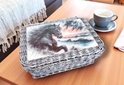 Košík s motivem černého koně, velikost 18x25 cm, výška cca 12 cm.